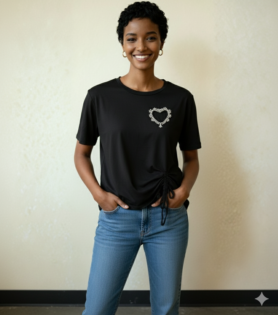 Add a touch of playful glamour to your casual look with the Crystal Heart Ruched Hem T-Shirt. This elevated black tee features a sparkling, intricate crystal heart appliqué on the chest, paired with a modern adjustable drawstring ruched hem. It perfectly blends everyday comfort with evening-ready sparkle and a customizable fit.